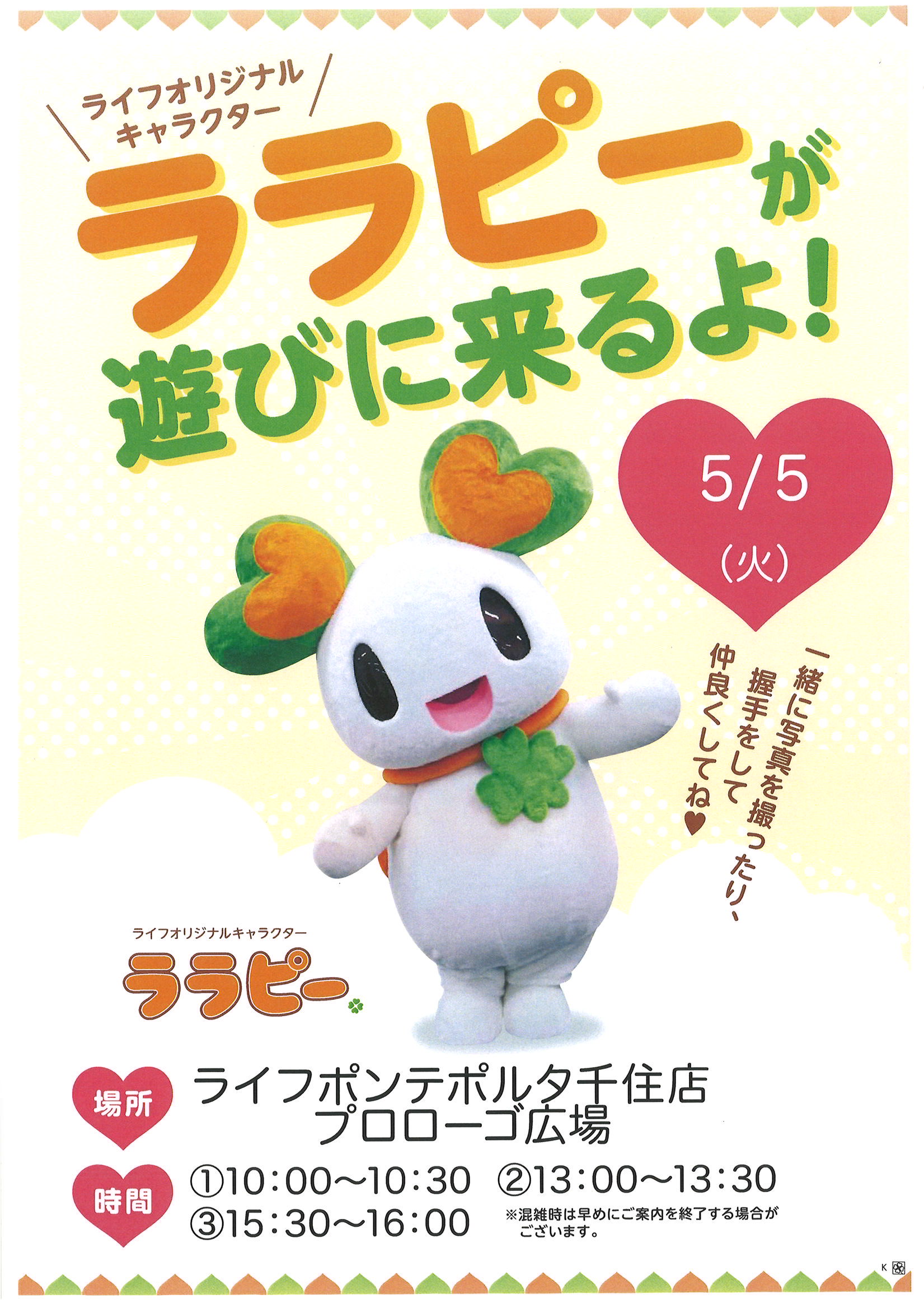 5月5日はライフへ行こう!ララピーがポンテポルタ千住店にやってくる💚