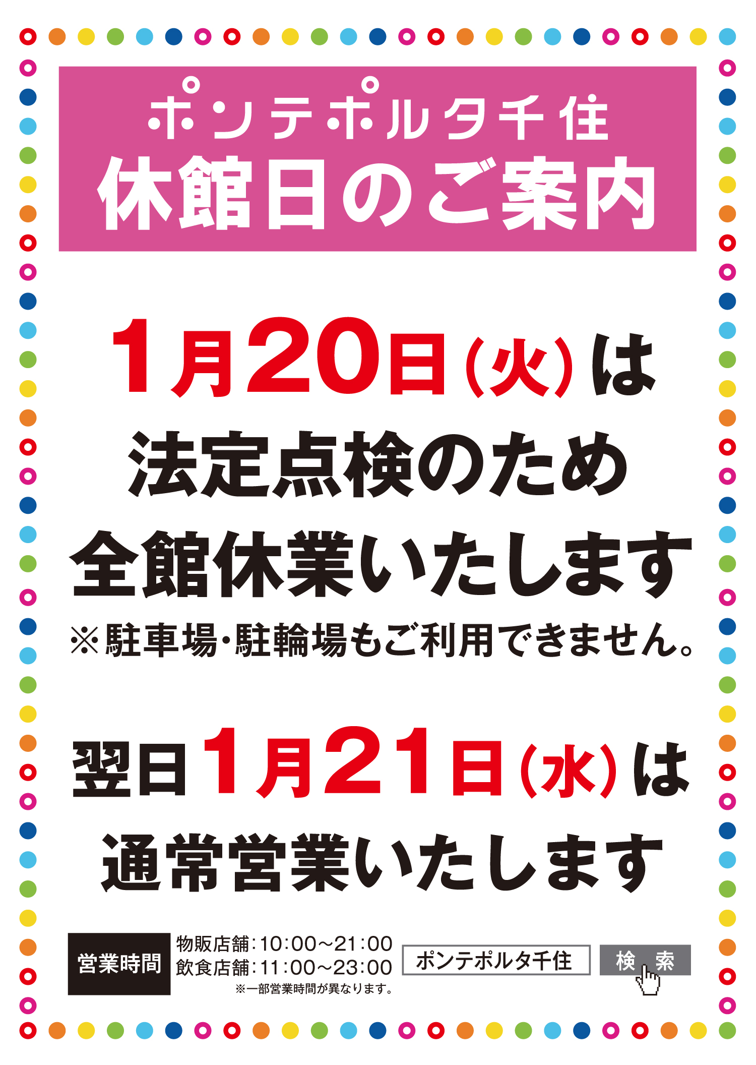 1月20日(火)法定点検のため全館休館