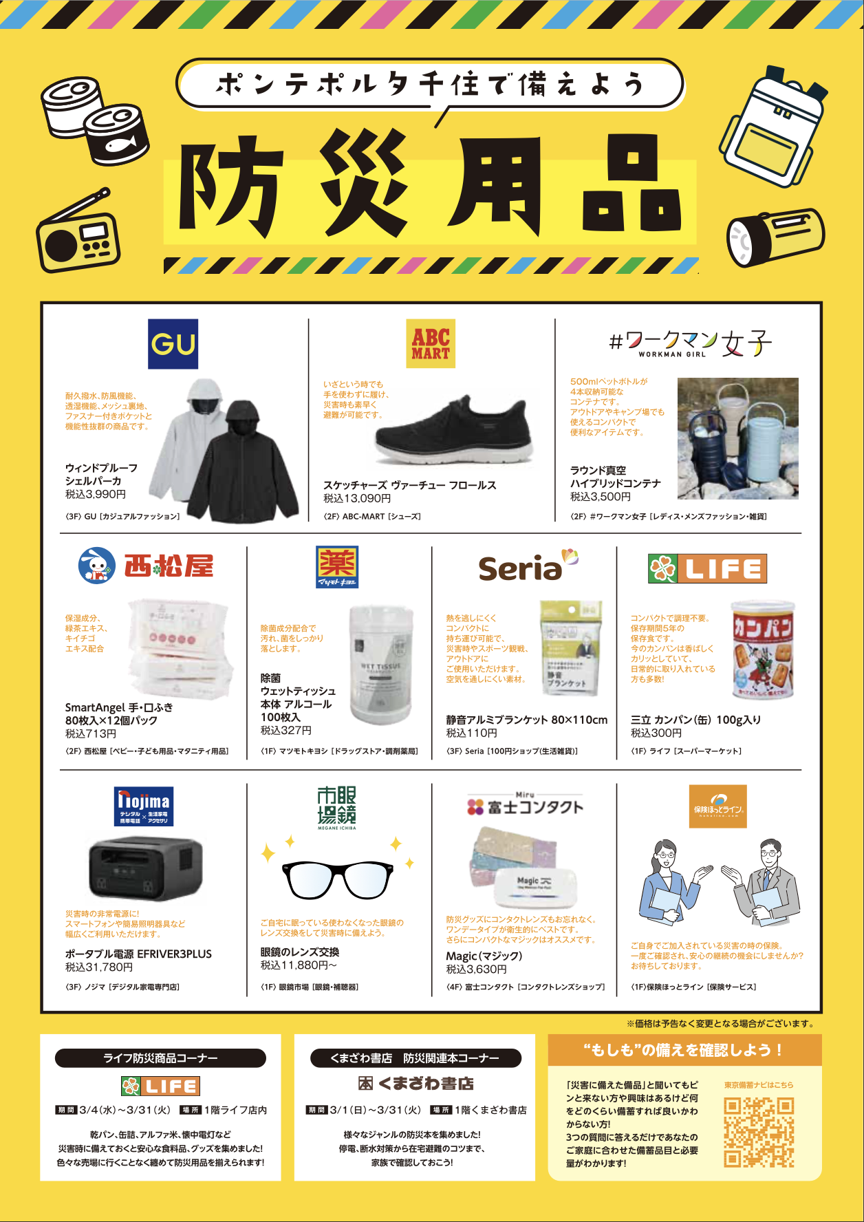 各店舗では災害時に役立つ商品を取り扱っています。この機会に自宅の“もしも”の備えを見直そう!何を備えたら良いか分からない、という方は、1階ライフの防災用品集めましたコーナーや1階くまざわ書店の防災関連本コーナーで揃えておくと安心な防災グッズをチェック!