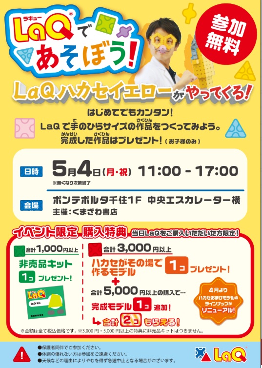 5月4日(月祝)にはLaQハカセイエローがやってくる「LaQであそぼう!」イベントを開催いたします!
